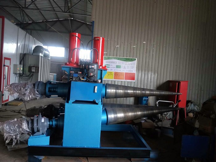 錐形卷板機卷板進程與進程一般都選用強制送料的辦法,靠錐形小口與卷板機前端強制限位擋塊磨擦,迫使錐形大小口成型發生速度差,到達卷板機上輥的素線一直與錐形坯料的素線重合,完結錐形成型,所以錐形小口下料時有留有錐形小口與卷板機限位擋塊彼此磨損效果的工藝余量。